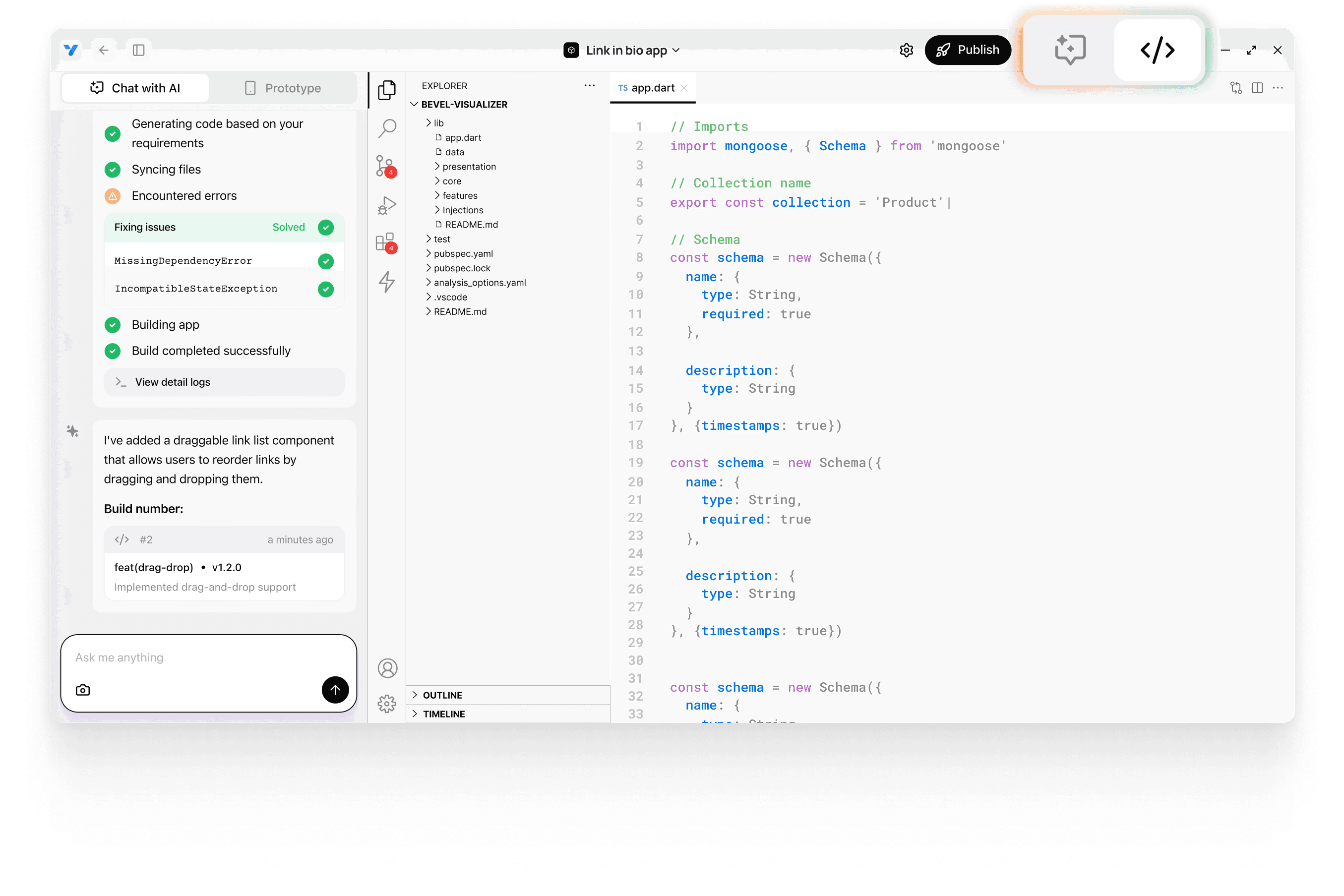 Write, edit, and fine-tune your code with a built-in editor — while your AI assistant offers real-time suggestions, fixes, and insights to help you build faster and smarter.